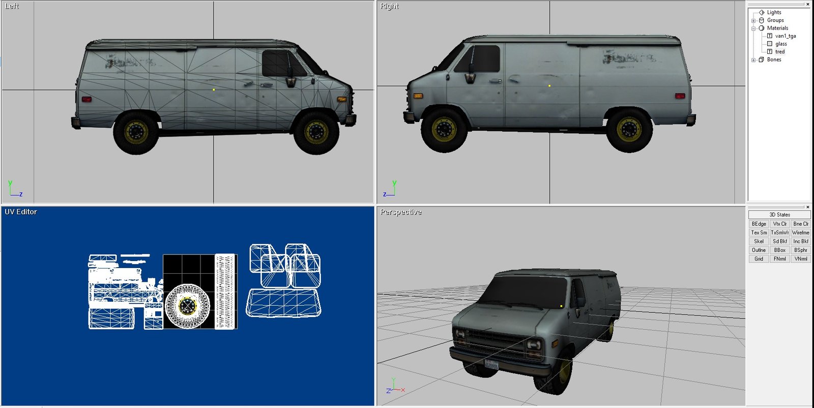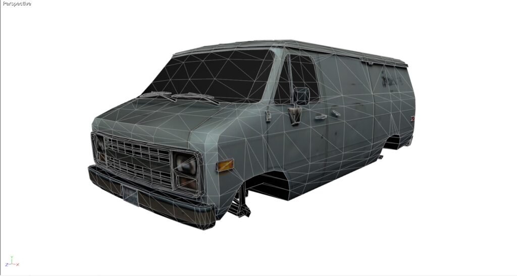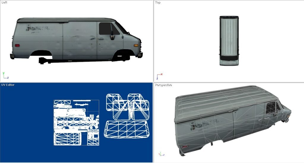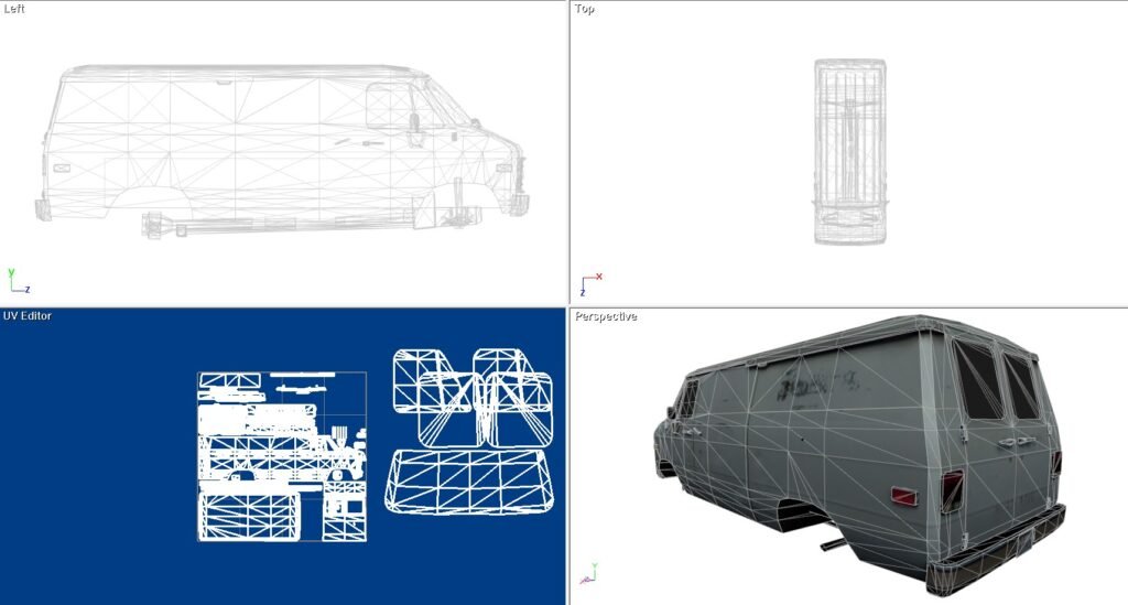This is a beater van. This is a model I purchased years ago for use in a game and to give me an idea of how to build what I wanted as opposed to what everybody else was building. I never used it after I realized it was teaching me a lot about UV work, not so much about 3D modeling. This is a Chevy work van in rough shape.